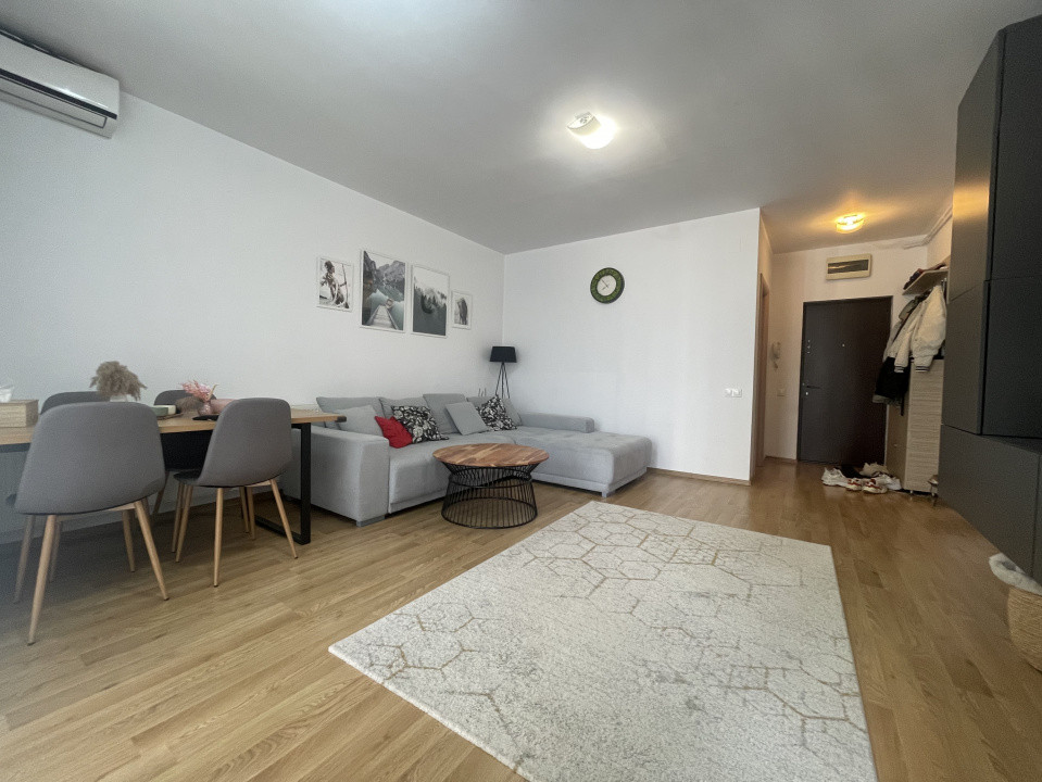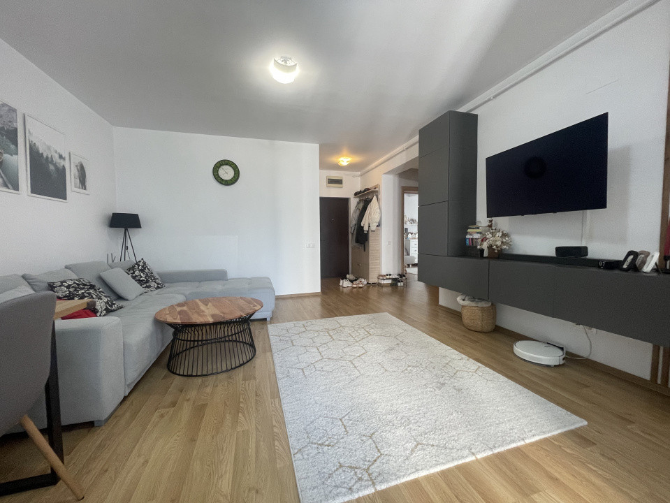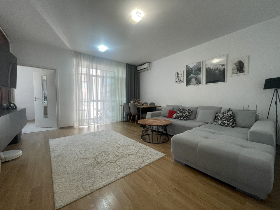 Livingul luminos, cu ferestre largi ce permit o abundență de lumină naturală, este decorat cu mobilier modern, ales cu grijă pentru a crea o atmosferă relaxantă. Culorile neutre ale pereților contribuie la o senzație de spațiu și liniște.