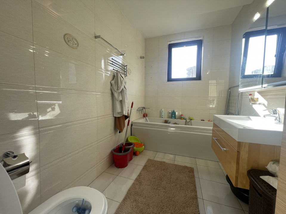 Baia principală, finisată cu materiale de calitate, oferă un spațiu elegant și bine organizat, dotat cu o cadă relaxantă și accesorii moderne. În plus, apartamentul beneficiază de o a doua baie, utilă pentru confortul zilnic.